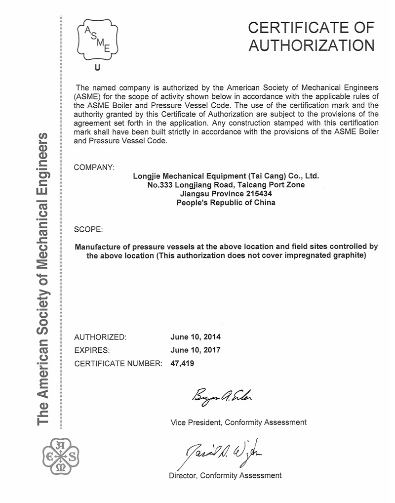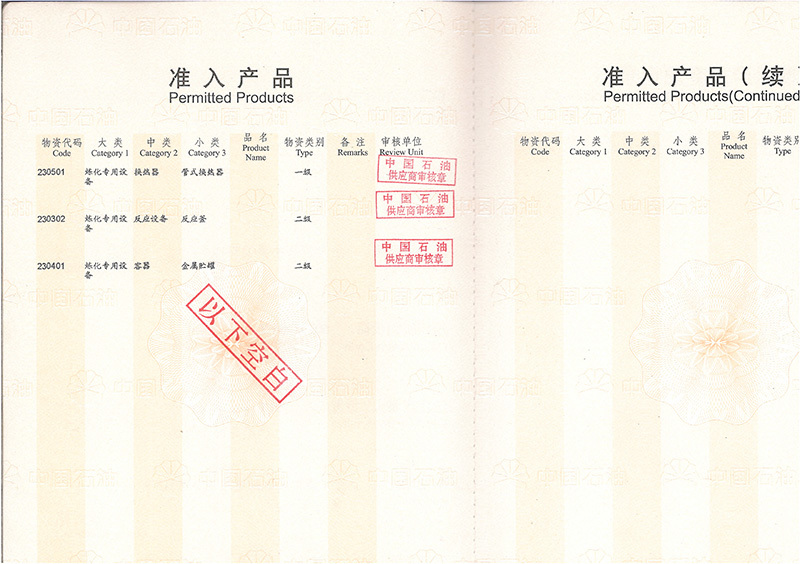 公司具有中國高、中低壓壓力容器生產(chǎn)許可證(A1級, 包含設(shè)計、制造),ASME U、U2鋼印證書,PED G模式生產(chǎn)資格,是中石化、中石油、中海油、中化集團、國家能源集團等大型知名企業(yè)的合格供應(yīng)商。